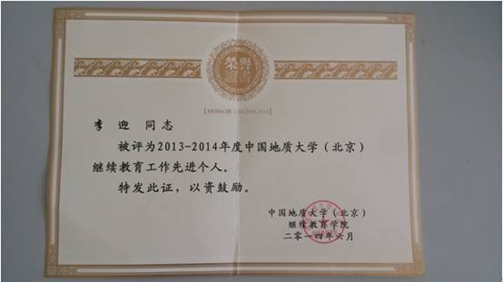 艾弗森貝博ballbet官網教學站獲得中國地質大學(北京)繼續教育學院2013-2014年度成人高等教育教學站先進單位。