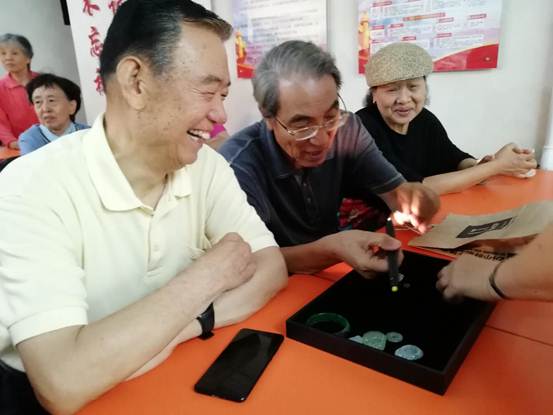 社區(qū)居民踴躍參加,現(xiàn)場氣氛活躍,劉老師準備了各種翡翠實物和鑒別工具,大家聽課、交流,運用學(xué)到的方法現(xiàn)場實踐,居民們還紛紛將自己帶來的寶貝進行鑒別、與老師熱烈討論。
